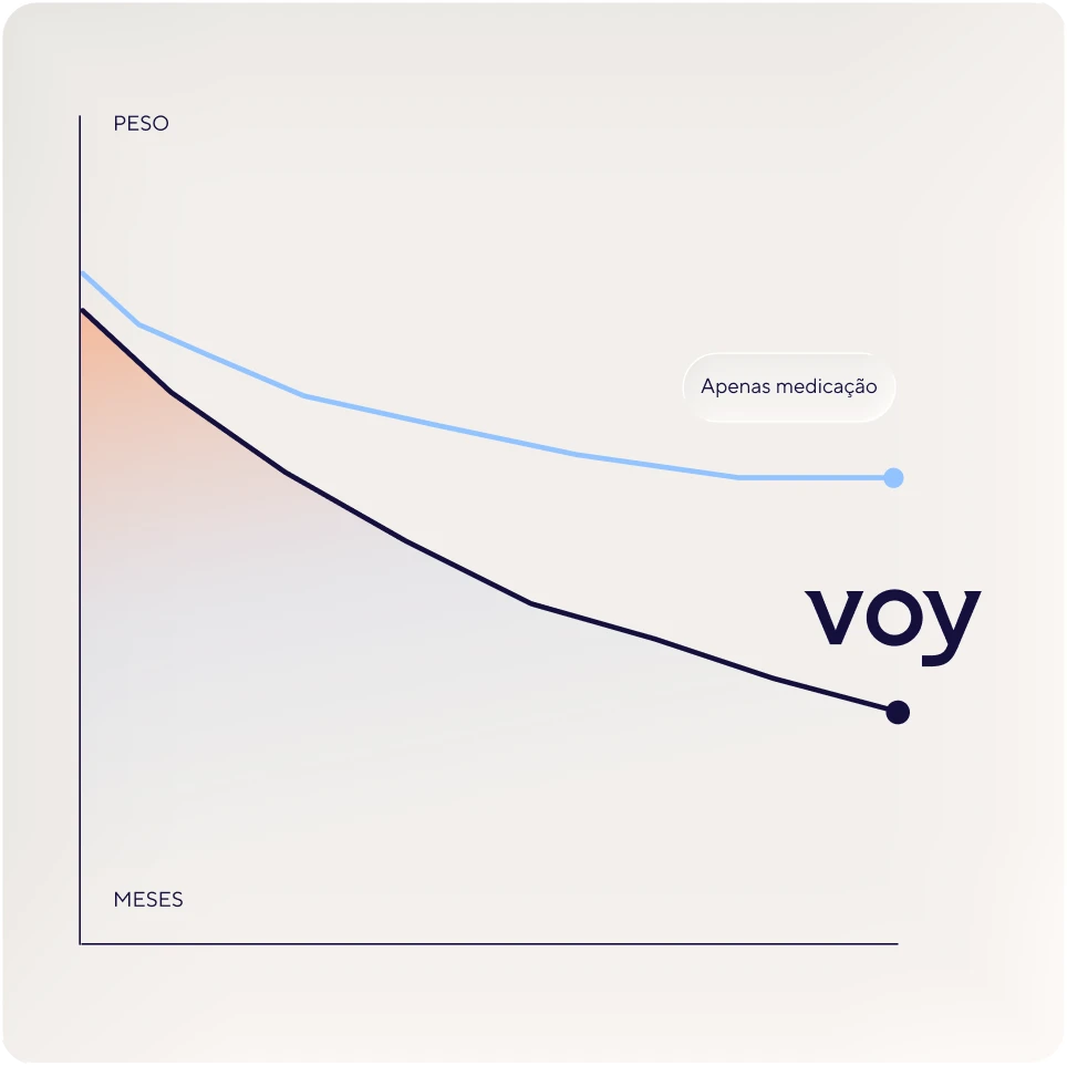 Com a VOY, você aprende a potencializar os efeitos do tratamento enquanto desenvolve hábitos que sustentam seus resultados ao longo do tempo. É por isso que pacientes que combinam medicação com acompanhamento estruturado tendem a perder até 20% mais peso em comparação ao uso isolado.